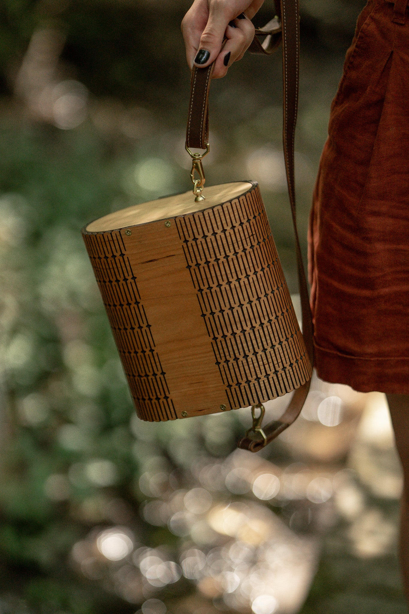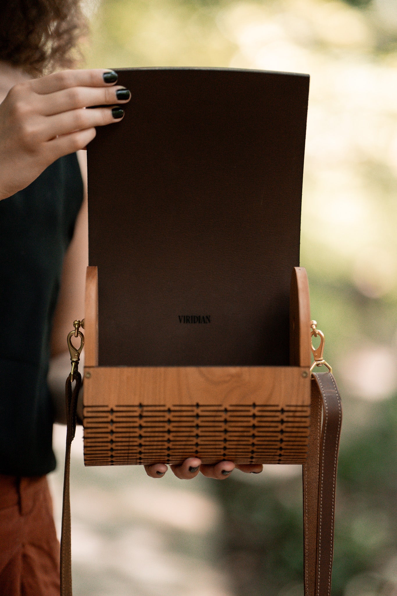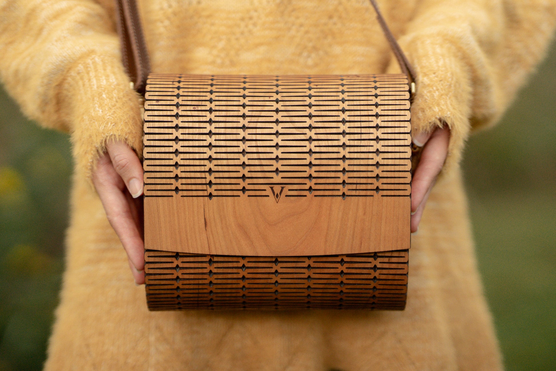 Care Instructions: Taking care of the exterior of the bag is akin to caring for solid hardwood furniture. Keep the bag dry. Extended exposure to sunlight can naturally alter the appearance of the wood. Wear and scratches are normal with regular use.